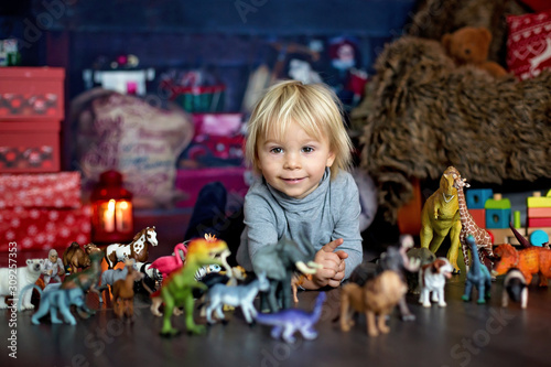 Sweet blonde toddler boy, playing with plastic animals and dinosaurs at home