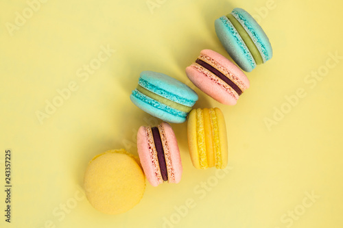 Sweet colorful French macaroon biscuits on yellow pastel background, top view. Flay lay selection of colorful macarons.