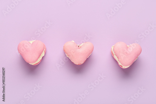 Sweet heart-shaped macaroons on lilac background. Valentine's Day celebration