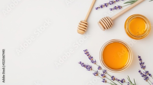 Sweet honey in glass bowls with lavender sprigs and honey dippers on a white background. Golden honey, purple flowers, and wooden dippers create a natural, calming scene.
