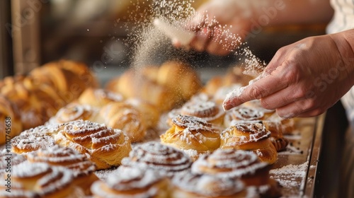Sweet Indulgence Baker's Hands Sprinkling Powdered Sugar on Fresh Pastries in a Bakery Display