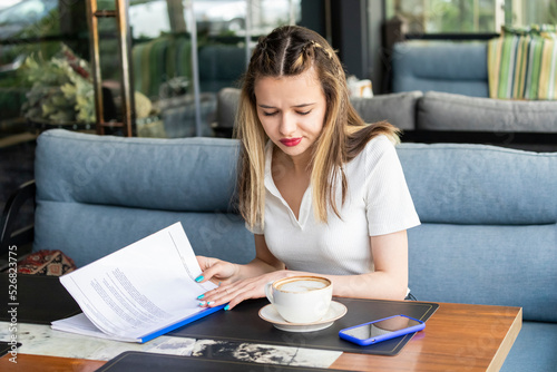 Sweet lady sitting at the restaurant and looking at her notes