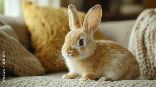 sweet little bunny with soft fur sitting indoors on a sofa looking cute and relaxed as a domestic pet enjoying a peaceful moment in a cozy home