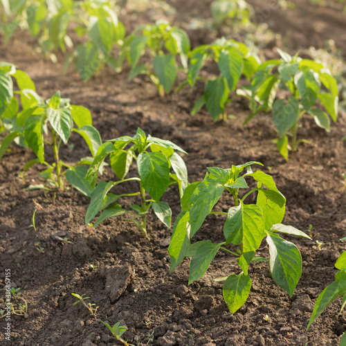 Sweet pepper shoots, spring sprouts on agricultural land, close-up shooting