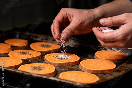 sweet potato, seasoning, sprinkling, coarse salt, sea salt, pepper, spice, slice, preparing, roasting, baking, chef, cook, cooking, kitchen, ingredient, vegetable, produce, raw food, fresh, hand, human hand, healthy eating, health food, epicure, preparation, vegan, vegetarian, diet, organic, receipe, side dish, homemade, nourishment, food photography, closeup, low key, orange, dark background, unprocessed