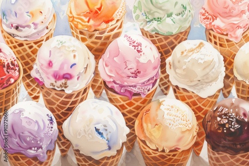 Sweet Summer Treats: Watercolor Illustration of Ice Cream Cones Set