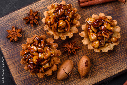 Sweet tasty tart with nuts and honey on a dark concrete background