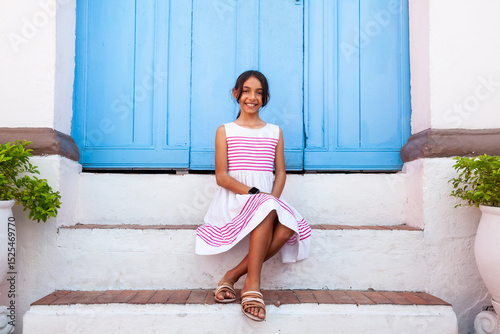 Sweet teenager girl in Cartagena de Indias. Travel concept. Sitting alone. Happy girl.
