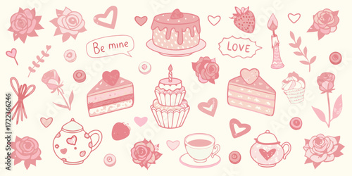 february 14, love, nubes, cake, rose, strawberry, tea, cupcake, teapot, candle, sweet, romantic, celebration, gift, greeting card, illustration, drawing, pink, pastel, cute, adorable, doodle, hand-drawn, whimsical, pattern, background, design, food, dessert, confectionery, be mine, romance, affection, sweetness, party, anniversary, wedding, birthday, celebrate, festive, invitation, scrapbook, sticker, decoration, element, collection