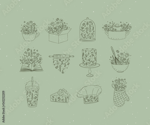 Sweets cooking appliances with flowers in hand drawing style on green background