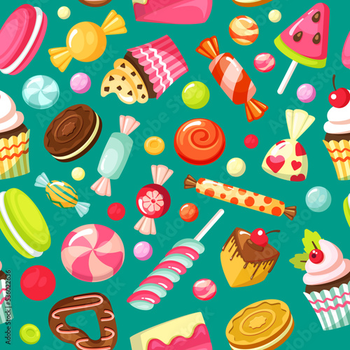 sweets pattern. cakes muffin lollipop delicious cupcakes. Vector seamless background