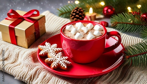 Świąteczna kawa, kakao lub czekolada w czerwonej filiżance z piankami i piernikami