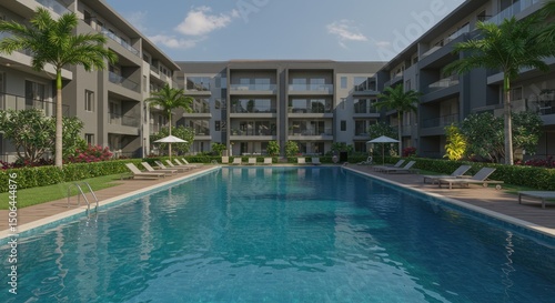 pool, swim, modern, relaxing, daytime, leisure, apartment, building, beach chair, palm, tree, exterior, architecture, balcony, facades, clear sky, edge, lawn, landscape, view, residential, property, surface, plant, courtyard, sun tanning, recreation, luxury, vacation, real estate, lifestyle