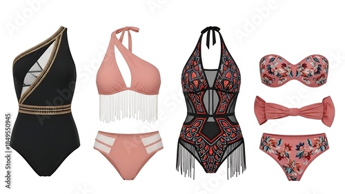 swimwear, bikini, swimwear, beachwear, fashion, style, design, clothing, apparel, summer, holiday, vacation, woman, female, swim, wear, isolated, copy space, studio shot, collection, assortment, pattern, texture, colours, red, black, pink, elegant, trendy, retail, swimwear, garment, studio, white background, product, template, textile, model, beach, seasonal