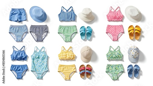 swimwear, swimwear, clothing, fashion, apparel, short, hat, sandal, beach, summer, vacation, holiday, travel, accessory, collection, design, style, pattern, colours, blue, pink, yellow, white, stripes, texture, studio, isolated, overhead, copy space, product, textile, lifestyle, element, garment, template, season, beachwear