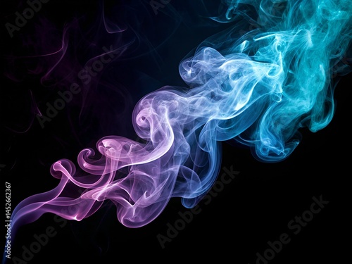 Swirling blue and purple smoke of vape on black background. A blue and purple smoke trail is shown in the air. The smoke is thick and long, and it is coming from a fire. Concept of danger and chaos