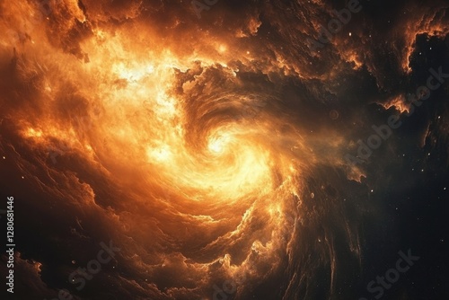 Swirling cosmic clouds radiate warm golden hues in a vibrant stellar formation