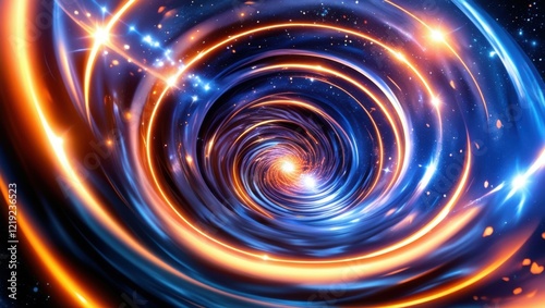 Swirling cosmic vortex, vibrant blue and orange energy streams, galactic spiral, dynamic space scene, celestial whirlpool, interstellar light trails, abstract cosmic art, deep space nebula, astronomic
