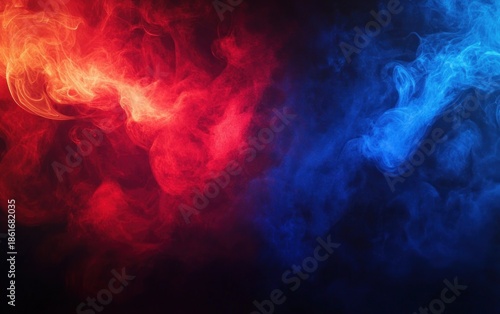 swirling red-orange and blue smoke plumes against a dark background, dramatic contrasting colors evoking intense tension, energy and mysterious atmosphere