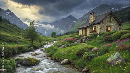 mountain, landscape, sky, nature, house, mountain, alps, river, summer, vale, grass, rock, water, cloud, tree, green, hill, forest, travel, snow, alpine, peak, view, hut, lake, swiss, stone, bungalow, flower, vacation