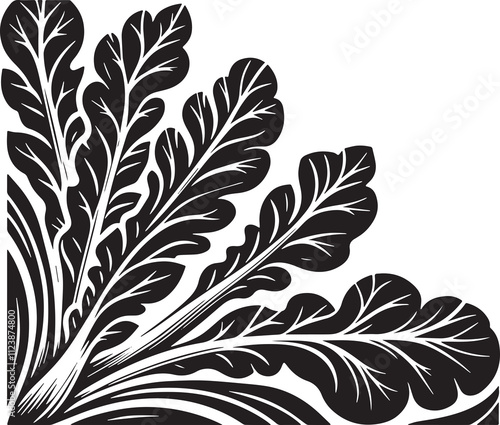Swiss Chard plant in art deco decoration, corner border, black and white illustration,