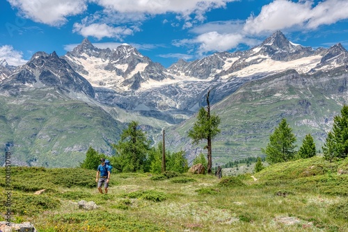 Swiss hiker Zermatt, beautiful mountain alps in the background, trees and trail, Swiss Alps hike