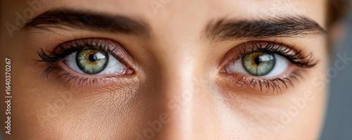 Swollen bags under circles and irritation concept. Close-up of a woman's striking green eyes with delicate lashes.