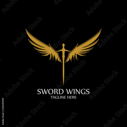 Sword with Wings. Golden Sword Symbol on Black Background.