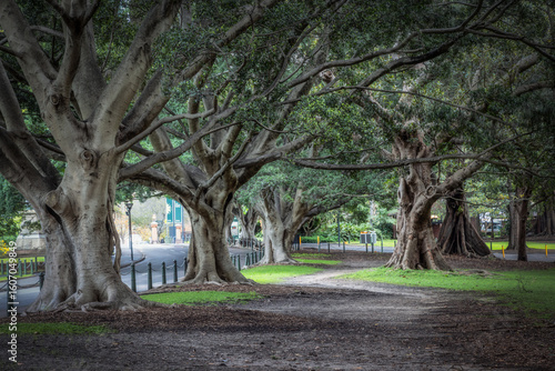 Sydney, Australia - 21 May 2025: View of a pathway winding through the lush Royal Botanic Garden, framed by the majestic canopy of ancient fig trees.