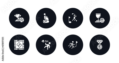 symbol for mobile filled icons set. filled icons such as football cup, exercise gym, golf player, basketball champion, board gaming, man losing hat, winning the race, champion vector.