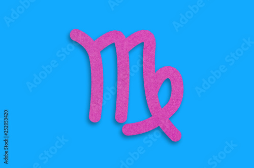 Symbol of astrological sign virgo cut out of purple paper in center on blue table. Top view. Horoscope concept