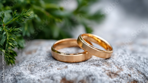 Symbol of Love: Two Golden Wedding Rings on Stone With Greenery Beside Them