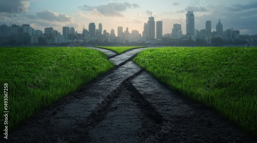 decision, pathway, choice, contrast, morality, business, growth, decayed, urban, skyline, flourishing, crumbling, symbolism, metaphor, ethic, success, bankruptcy, journey, exploration, direction, perspective, future, nature, landscape, risk, opportunity, duality, vision, development, conflict, prosperity, strategic, planning, innovation, corporate, dilemma, leadership, navigation, potential, assessment, nirvana, insight, change, challenge, sustainability, dynamic, investment, transformation
