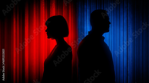 silhouette, man, woman, red, blue, light, neon, duality, digital, futuristic, abstract, conflict, choice, backlight, concept, identity, boundary, contrast, balance, technology, human, shadow, glow, cyber, network, division, philosophy, decision, power, datum, society, divergence, tension, symbolic, modern, virtual, emotional, binary, graphic, minimalism, innovation, creative, inspiration, visualisation, dark, code, spectrum, highlight