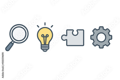 Symbols representing search, ideas, problem-solving, and mechanics in a clean design