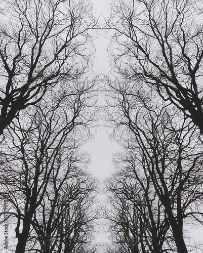Symmetrical bare tree branches form a dark tunnel effect, creating a sense of depth and mystery.
