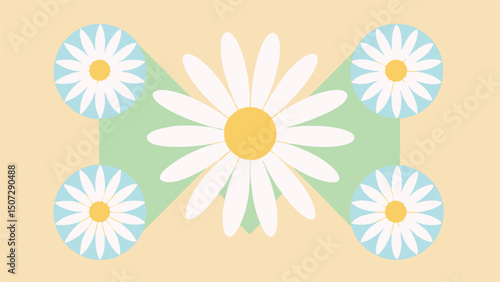 Symmetrical Daisy Flower Design with Central Bloom and Four Smaller Daisies – Hand-Drawn Vector on Beige and Blue Background Symbolizing Harmony, Nature, and Whimsical Floral Aesthetics