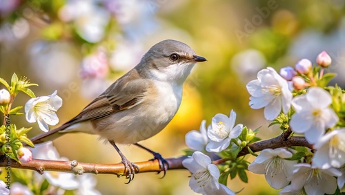 Symmetrical image of lesser whitethroat in flowering tree