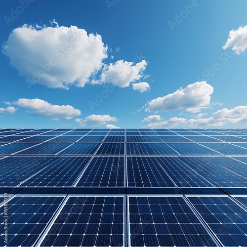 symmetrical solar panels on rooftop under sunny sky, ultra-clear modern architectural view