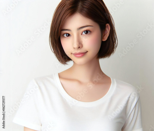 beauty, woman, japanese, brown-haired, shortcut, white background, t-shirt, white, ai