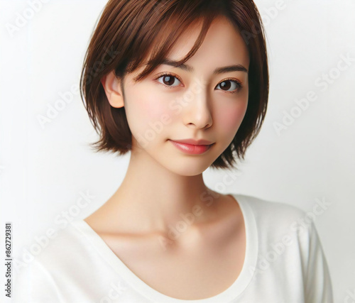 beauty, woman, japanese, brown-haired, shortcut, white background, t-shirt, white, ai