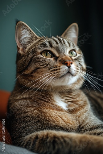 Tabby cat rests, eyes alert, fluffy fur.