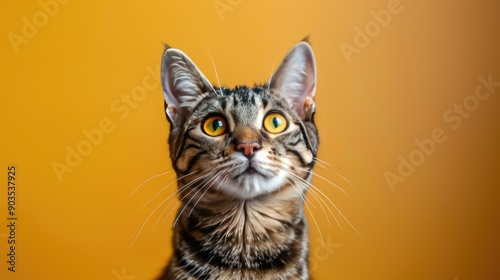 cat, tabby, felino, animal, pet, domestic, mammal, fur, whisker, eye, yellow, orange, brown, black, white, nose, face, head, ear, looking, up, gaze, curious, attention, portrait, cute, soft, fluffy, playful, adorable, background, colours, studio, light, shadow, sharpened, sharp, vibrant, nature, wildlife