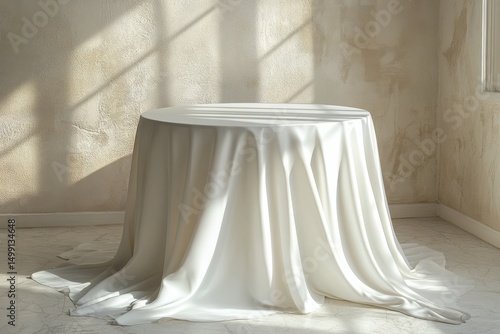 table, white, clothes, fabric, drape, shadow, light, window, room, interior, surface, empty, minimal, clean, elegant, texture, smooth, studio, background, presentation, display, cover, textile, indoor, still life, round, furniture, design, simple, neutral, soft, ivory