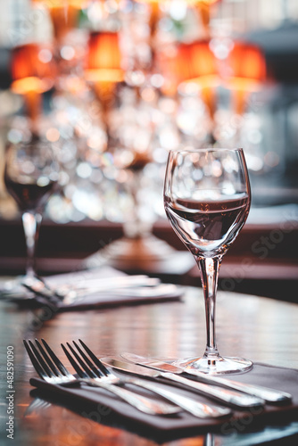 glasses, wine, table, eatery, drink, dinner, wine glass, celebration, alcohol, goggles, red, white, setting, wedding, plate, empty, party, crystal, cafes, meal, lunch, fork, dining