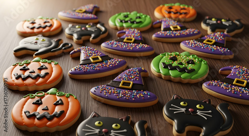 Table with cookies shaped like pumpkins, witches, and cats, covered in colorful icing, precise details in chocolate and sprinkles, lighting that highlights texture and colors.