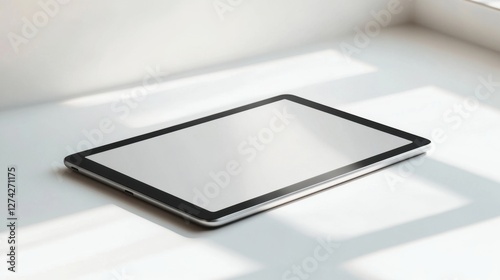 Tablet computer placed on a white table with minimalist background for modern technology concept