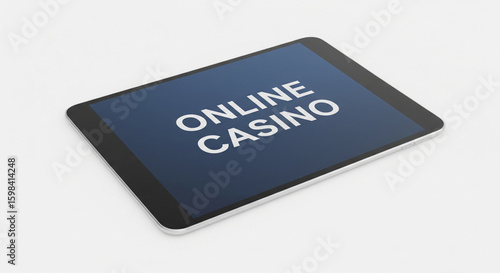 Tablet isolated on white background, the inscription "ONLINE CASINO" on the smartphone screen, minimalism. High quality, 3D rendering. Concept of gambling addiction, online fraud, fake casino, jackpot