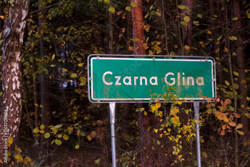 Tablica z nazwą miejscowości CZARNA GLINA w lesie jesienią po zmroku. Tablica na początku wsi położonej wśród lasów, w anturażu jesiennym o zmierzchu.
