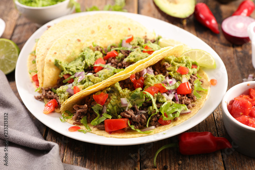 taco, fajita, bread, tortilla, beef, avocado, tomatoes, onion, cheese, meat, meal, sauce, spicey, lettuce, guacamole, food, ingredient, cook, cooking, cookery, dinner, lunch, eatery, wood, background